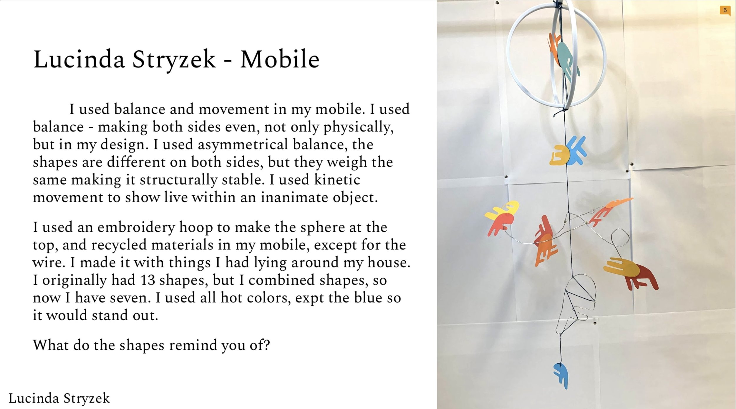 Alexander Calder invented the concept of “mobile” to break down the static form of sculpture. Students(6-8th grades) used Aluminum wire ad pliers to make their versions of mobile sculpture. They also used construction paper and recycled materials.